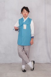 淡いグレーのパジと白のチョゴリ、ブルーのケジャのセットです。